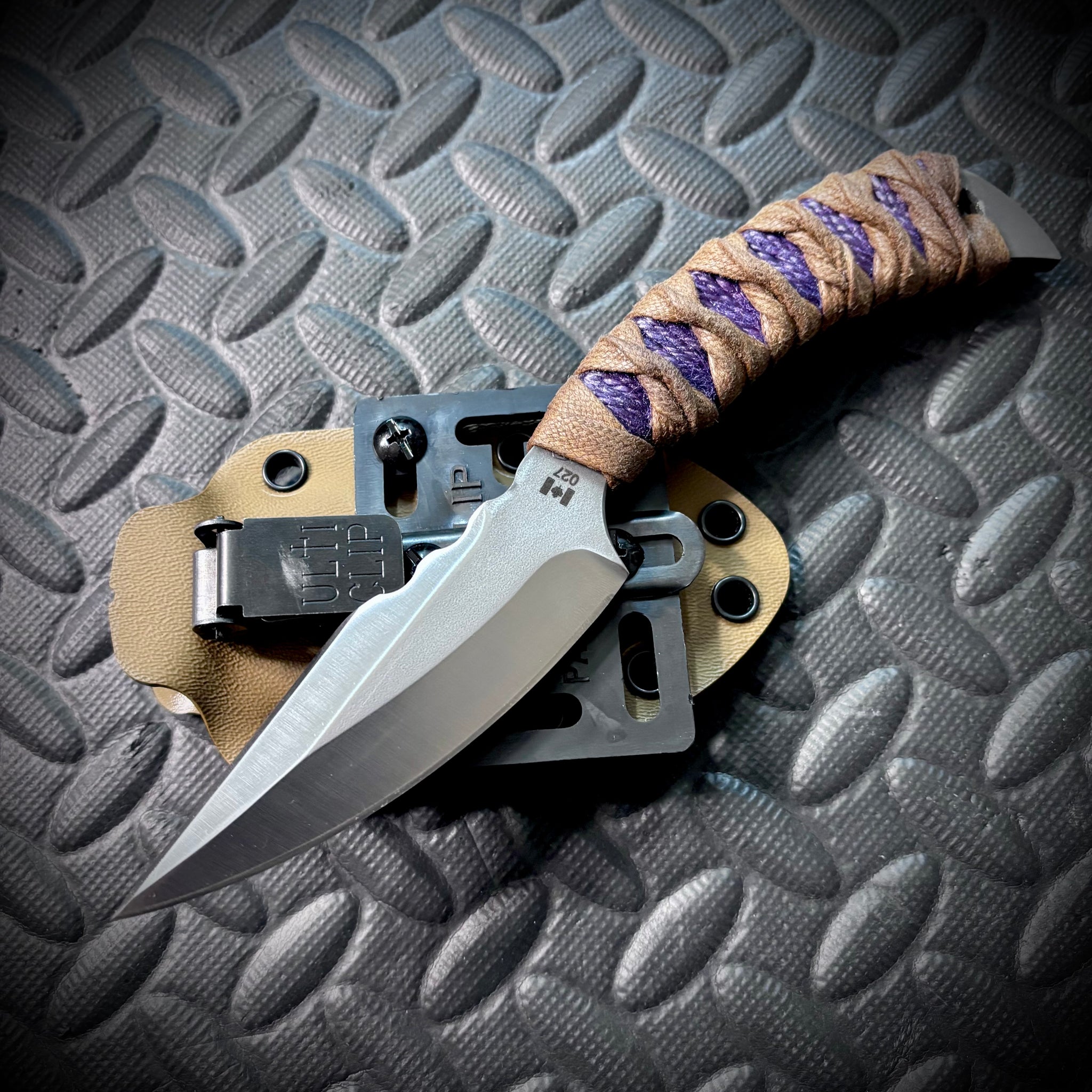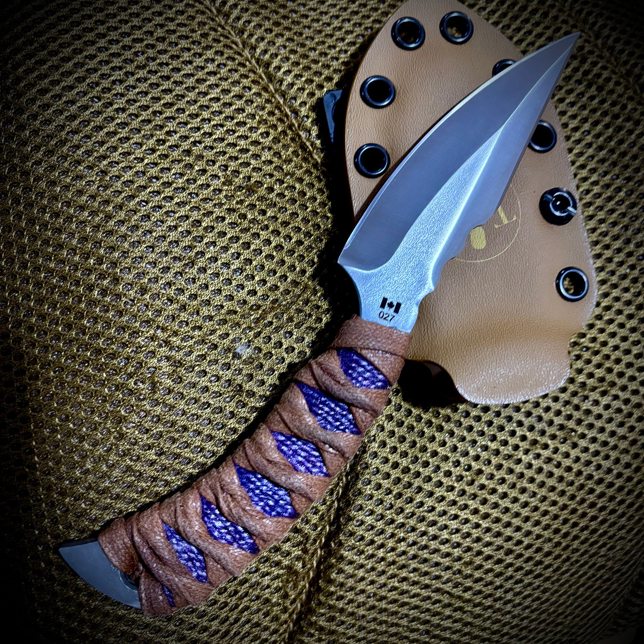 The Half-Cut V2 . 3/16 stock NitroV at 60-61HRC, epoxy soaked cord wrap. 3.7 inch double edged blade. 7.5 inches overall. Comes ambi carry with ulticlip . Double edged EDC.