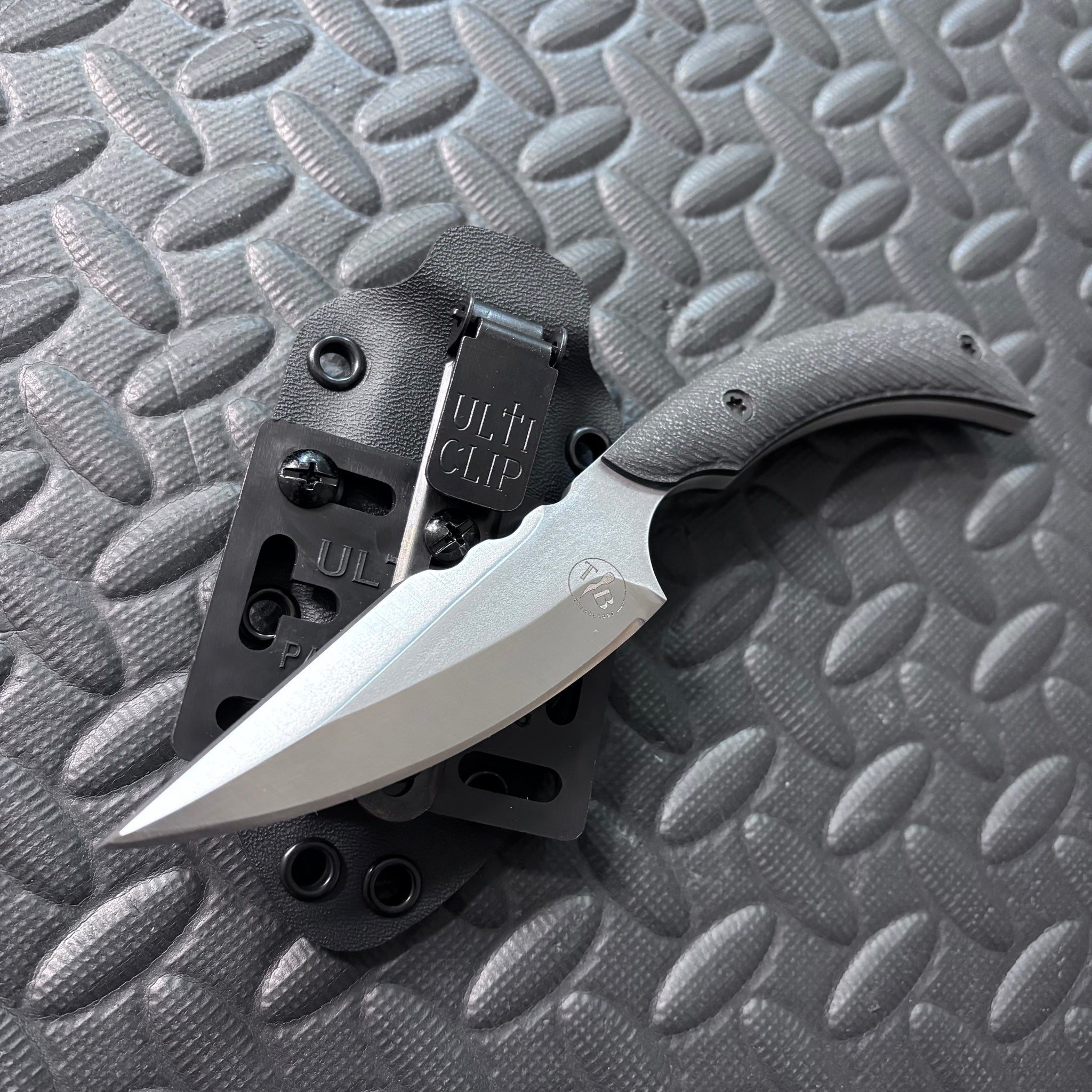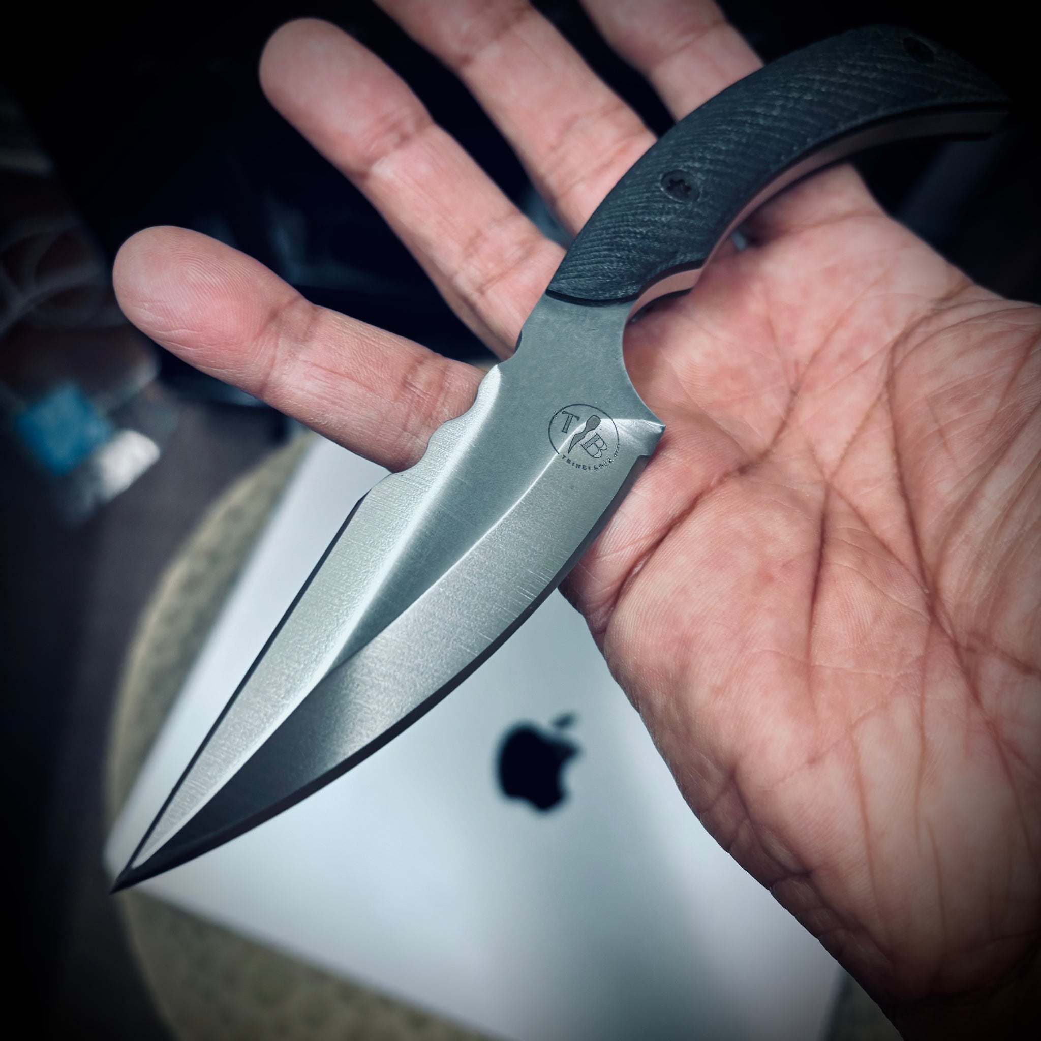 The Half-Cut V2 . 3/16 stock NitroV at 60-61HRC, Removable g10 scales. 3.7 inch double edged blade. 7.5 inches overall. Comes ambi carry with ulticlip . Double edged EDC.