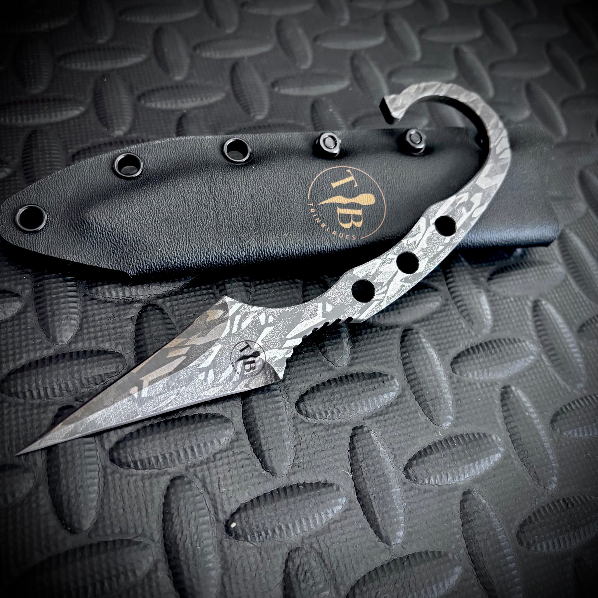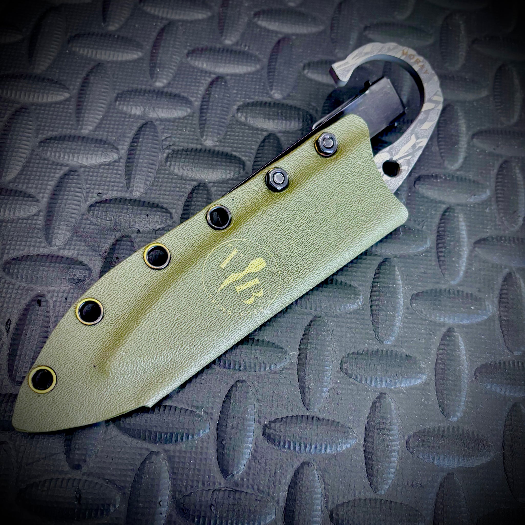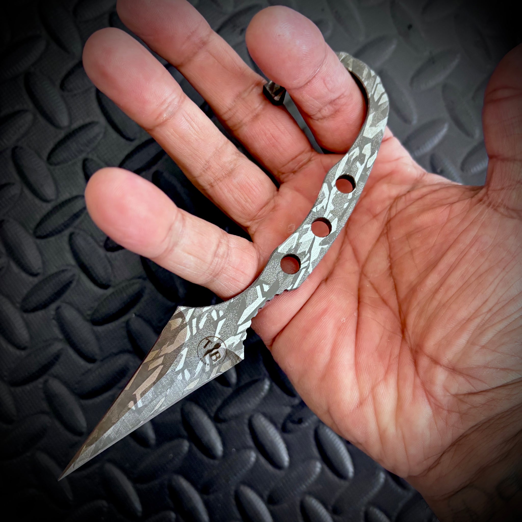 6.5 inches total with 2.75 inch blade. 4.1 Oz. . 3/16 NitroV stainless steel at 60hrc . Acid stone washed with polished bevels. Jade G10 G10 scales With Ultem pins. 1.25 inch finger hole for gloved hands. Kydex sheath with ulticlip. Meant for Pikal grip . Blade will not be suitable for very large hands. Comes with 3d prinbted trainer.