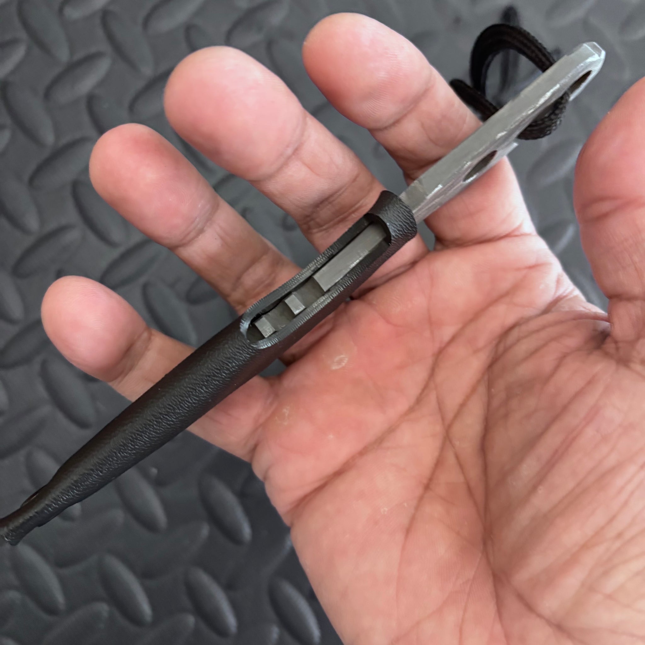 6 3/4 inches total length with a 2.5 inch double edge chisel ground blade . 3/16 thick AEB-L stainless steel at 60-61 HRC. 2.4 OZ . Finger hook to aid in retention and deployment without some of the potential drawbacks of a finger ring. Jimped behind the blade and on the finger hook to aid in retention and deployment.
